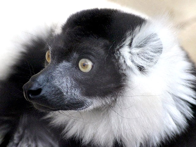 | エリマキキツネザルはマダガスカル島の熱帯多雨林だけに生息しているキツネザルの仲間で、キツネザルの中ではもっとも体が大きく、がっしりした感じがする。 クロシロエリマキキツネザル(本種/Varecia variegata)とアカエリマキキツネザル(Varecia rubra / Red Ruffed Lemur)の2種が知られているが、いずれも体色ははっきりと分かれている。 クロシロエリマキキツネザルの毛色は白と黒に分けられていて、顔のまわりには長いふさ毛がエリマキのように生えていて、これが名前の由来になっている。 また、アカエリマキキツネザルでは、クロシロエリマキキツネザルの白色の毛が赤茶色になっているが、両種共、いずれも体毛は長く、体全体を密に覆っている。 キツネのようにとがった鼻も特徴的で、嗅覚は鋭い。 本種・クロシロエリマキキツネザルはマダガスカル島東部の湿度の高い常緑樹林に生息していて、ほとんど樹上生活をしている。 標高1300m辺りまで生息していて、ふつうは2~5頭程の家族単位の小さな群れで暮らしているが、時には10~16頭程の群れも見られる。 昼間に行動するが、特に朝方や夕方には活発に活動し、樹間や枝から枝へと敏捷に動きまわる。 行動範囲は食料事情などによって幅があり、0.15~2k㎡と大きく変化するとされている。 樹冠近くで主に果実類を採食するが、木の葉や花なども食べる。 手は親指と他の指が対向していて、木の枝や物をつかむことができるが、採食するときにはあまり手を使わず、直接口で食べることが多い。 また、いくつかの地域では、地上に降りて菌類や土壌を食べることも観察されている。 土を食べることはワオキツネザルなどでも観察されているが、これはナトリウムの摂取量を増やすためだと考えられていて、土壌に含まれている塩分を摂取していると言われている。 しばしば群れ全体で大きな鳴き声をあげるが、その鳴き声は一頭だけでもかなり遠くまで聞こえる。 この鳴き声は動物園などでもよく聞くが、縄張りを示すものだと考えられている。 繁殖は6~7月頃に見られ、一夫一婦と言われているが、一夫多妻であるのではないかとも考えられている。 妊娠期間は90~102日程で、1産2~6子、普通は2~3子を出産する。 キツネザルは原始的なサルだが、エリマキキツネザルはサルにしてはめずらしく樹上に簡単な巣を作り、そこで子育てを行う習性がある。 また、キツネザルの仲間は、菜食に出かけるときなどは子どもを一緒に連れて行くが、エリマキキツネザルだけは子どもを巣において採食に出かけると言われている。 子どもには半年ほどの授乳期間があり、雌雄共に2年程で性成熟する。 野生での寿命は20年程度と言われているが、飼育下では30年を超えるものも知られている。 外敵はフォッサなどだが、近年では森林伐採などの影響で、キツネザルの仲間の生息数は減少している。 エリマキキツネザルも同様で、生息地も分断されてしまい、生息数はかなり減少している。 現在、クロシロエリマキキツネザルには下の3亜種が知られているが、いずれも生息数が少なく、国際自然保護連合(IUCN)の保存状況評価によって絶滅危惧種・CRとして保護されている状況になってしまっている。