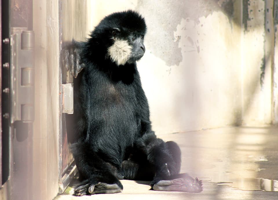| ホオジロテナガザルは雌雄で毛色が異なっていて、雄は全身が黒く、頬には白い房毛がある。 テナガザルの仲間は生息数が減少しているが、ホオジロテナガザルも個体数が少なく、分布域も限られた地域になっている。