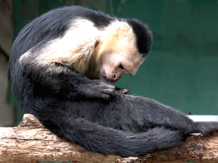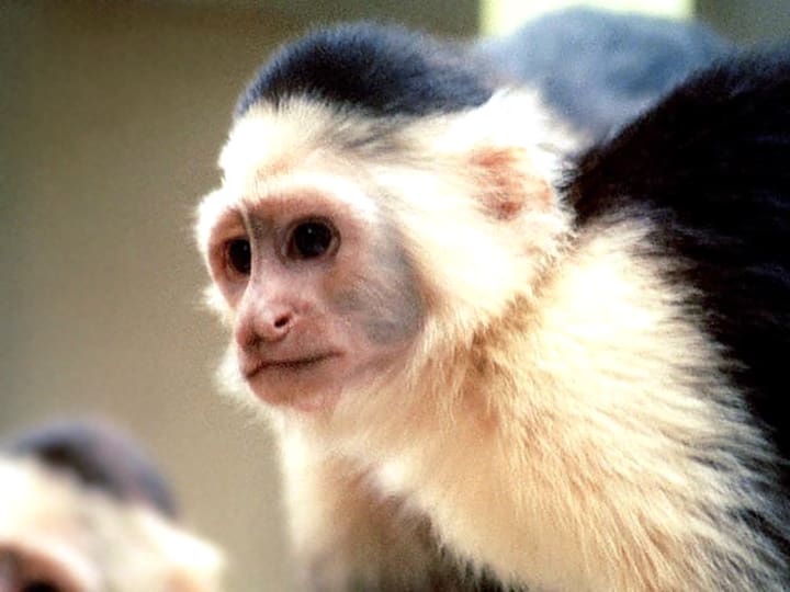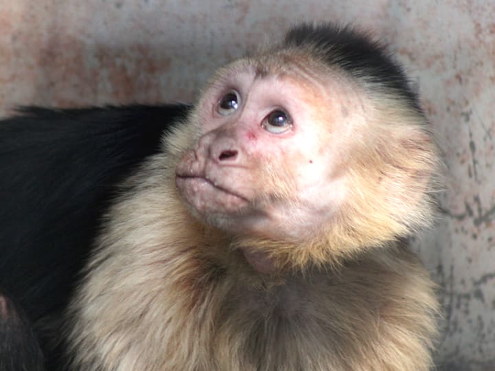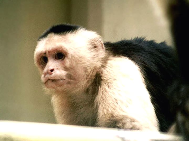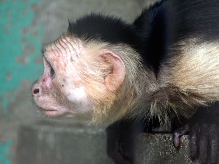 ノドジロオマキザルは中央アメリカから南アメリカにかけて分布していて、群れをつくって生活している。 顔の周囲は白っぽい色をしているが、頭頂が黒いので、帽子をかぶっているようにも見える。