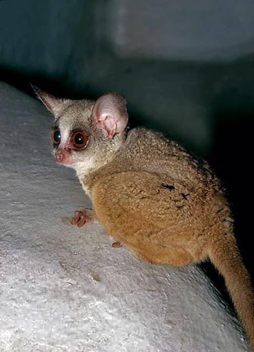 ショウガラゴの分布域・生息環境 ショウガラゴは、西アフリカのセネガルからブルキナファソ、ナイジェリアなどを経て、チャドや中央アフリカ共和国、コンゴ民主共和国などを通り、東はエチオピアやケニア、ソマリアまで、アフリカ中央部に帯のように分布している。 アフリカ大陸で最も広く分布している霊長類とも言われていて、タンザニアにも分布している。 ショウガラゴは深い森林や雑木林、荒れた草木地帯など、多雨林地帯と周辺のさまざまな環境に適応していて、草原地帯では見られないが、河川沿いの森林や耕作地周辺の森林などにも生息している。 ショウガラゴの大きさ・特徴 ショウガラゴは、体長が15~20cm程度、体重150~300g程で、雄は雌よりも僅かに大きい。 体毛は短いが密生していて厚く、鼻や四肢の裏側以外は全身が毛で被われている。 毛色は銀灰色から褐色、灰褐色などをしていて、目は大きくて丸く、耳も大きくてよく目立つのが特徴になっている。 ショウガラゴの耳は左右を別々に動かすことができるほか、自由に曲げたり折りたたむこともできる。 その為、暗闇の中でも獲物の音を聞き取ることができ、外敵などの位置もよくとらえることができる。 四肢には5本の指をもっているが、指は長く、指先にはしっかりと木の枝などを握ることができるように平らな肉球がある。 また、後肢の第2指だけは鉤爪で、他の爪はすべて平爪になっているが、後肢の筋肉はよく発達していて、ショウガラゴは跳躍力にも優れている。 体は小さく、オオガラゴの半分程度しかないが、握力も強く、後ろ足だけで木の枝にぶら下がることができ、そのまま体を起こすこともできる。 尾も体長よりも長く、樹上でバランスを取る役目を果たしている。 ショウガラゴの生態・生活 ショウガラゴはさまざまな森林地帯やサバンナ林などに生息していて、2~5頭ほどの小さな群れで生活している。 大きな群れをつくることは滅多になく、普通は雌はその子どもたちと生活し、雄は単独で生活しているか少数の群れをつくっている。 ショウガラゴはほぼ完全な夜行性の動物で、昼間は木の洞や茂みなどにつくった巣の中で休んでいるが、時には鳥が使い終わった古い巣穴などを利用して眠っている。 夜になると寝床を離れて活動をはじめるが、採餌は単独で行われ、夜明け頃になると再び寝床に集まってくる。 雌雄はそれぞれに行動範囲をもっていて、はっきりとした行動範囲は分からないが、ひと晩に2km程を移動するとも言われている。 また、ふつうは雄の行動範囲は雌よりも広く、1~5頭ほどの雌の行動範囲と重なっている。 行動範囲は縄張りにも結び付いていて、縄張りには尿でマーキングをするが、ショウガラゴは手足を尿で湿らす習性がある。 これは、移動したときに手足につけた尿が樹木などについて残り、その後が縄張りの印になる為と考えられている。 動きはかなり素早く、同じ夜行性であるスローロリスなどとは違って、暗闇の中でも枝から枝へ敏捷に移動し、動物園などで見ていても、目には止まらないほどの速さで動き回っている。 樹上では、水平に延びる枝よりも、垂直に延びる幹などにしがみつく習性があるが、ショウガラゴはリスの様に頭を下にして木から降りることもできる。 棘などがある植物の間は、耳を後ろに折り曲げるようにして抜けて行くが、地上でも俊敏で、跳躍力に優れた後肢で跳躍し、その距離は3m以上にもなる。 また、短い距離なら後足だけでピョンピョンと跳ねるように移動する。 食性は雑食性で、樹脂や果実、種子などのほか、無脊椎動物や小鳥、その卵なども食べる。 採餌は樹上と地上の両方で行われるが、昆虫類もよく捕らえ、特にバッタ類を好む。 昆虫類を捕らえるときは跳躍して飛びついて捕まえるが、聴力はかなり優れていて、昆虫の羽ばたく音を聞き分け、手を伸ばして捕まえることもある。 この時、大きな目が役立っているが、ショウガラゴの目にはイヌやネコなどに見られる「輝膜(こうまく、タペタムとも)」と呼ばれる反射層があり、これによって光を増幅して、暗闇でも正確にものをとらえることができている。 また、ショウガラゴは樹脂をよく食べるが、樹脂は昆虫の少ない寒い時期には大切な食料源になっている。 樹脂は舐めとったり、固まったものは齧りとったりして食べるが、樹脂に含まれるタンパク質やカルシウムなどは昆虫や果物類の10倍ほどもあると言われている。 樹脂にはマグネシウムやカリウム、繊維質なども含まれていて、胃の中には樹脂を分解するバクテリアがあり、効率よく栄養を摂取している。 また、ショウガラゴは夜行性だが、気温が低い時には夜間の採餌時間を減らし、日中に活動することもある。 性質はおとなしく、鳴き声は高いチューチューというような声をあげるが、様々な鳴き声を出して仲間とのコミュニケーションをとり、特に朝夕にはよく鳴き声をあげる。 外敵はジャコウネコの仲間などが考えら