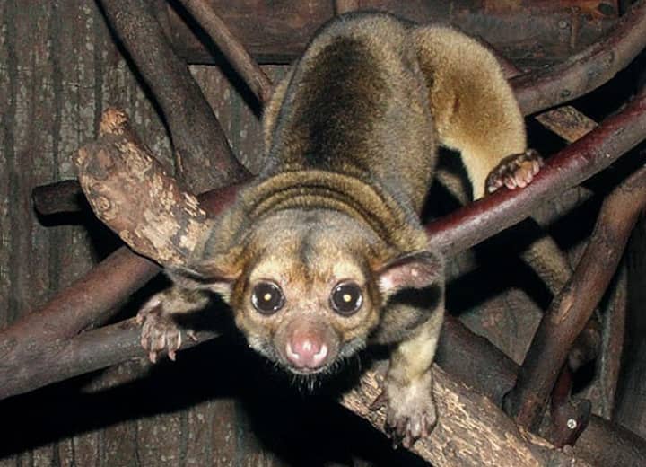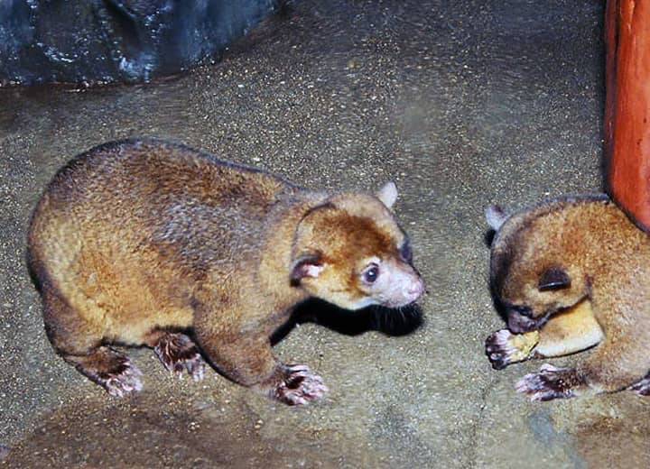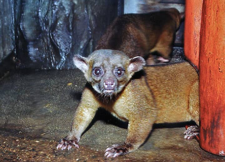 | キンカジューはアライグマ科の動物で、中央アメリカや南アメリカなどに分布している。 完全な夜行性で、夕暮れ時から活動をはじめ、果実類を主に食べている。
