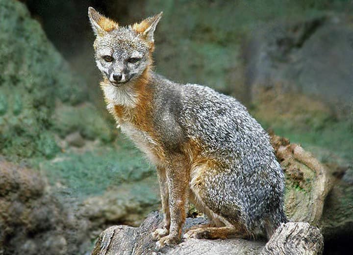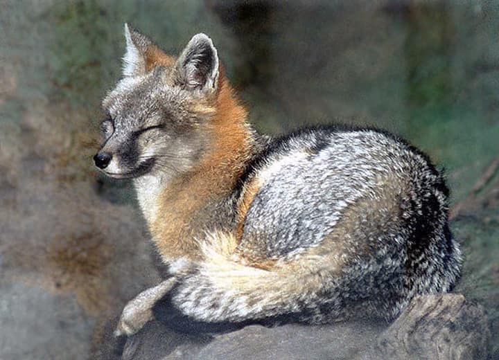 ハイイロギツネの分布域・生息環境 ハイイロギツネは、カナダ南部からメキシコを経て南アメリカ北部のベネズエラとコロンビアなどかけて広範囲に分布している。 主に森林や低木林など、樹木の多いところに生息しているが、森林と耕作地が混在するような環境や、岩の多い疎林などにも生息している。 また、ハイイロギツネは水源からあまり遠くないところで見られることが多く、高くても標高3000m辺りまでに生息している。 ハイイロギツネの大きさ・特徴 ハイイロギツネは体長49~70cm、体重は3~9kgとやや幅があるが、概ね3~5kg程の重さがある。 体は雄の方が少し大きいが、雌雄ともに尾は毛がフサフサとしていて長く、体長の半分かそれ以上の長さがある。 尾の付け根から3分の1から半分ほどの位置には臭腺があり、背中や尾の正中線は黒くなっている。 毛色は背中から体側部、尾などは灰色で、胸や足の内側、腹部は白っぽい色をしている。 また、首の側面や尾の裏側などのほか、灰色の背と腹部の白色との間は黄褐色や赤褐色のような色をしているのが特徴になっている。 ハイイロギツネの生態・生活 ハイイロギツネは主に森林地帯などに生息しているが、森林と農地が混在しているようなところにも多く見られ、標高3000m程の高地にも姿を見せる。 普段は単独で生活しているが、繁殖期や子育ての間は家族単位で生活し、ペアの仲はよいと言われている。 日中にも活動するが、ハイイロギツネは主として夜行性の動物で、昼間は巣穴などで休み、夕方になると活動をはじめる。 巣穴は、あまり土を掘ってつくることはなく、藪の中の岩のくぼみや岩穴、木の洞などを利用することが多く、時にはマーモットの仲間であるウッドチャックが使った巣穴を拡大して使うこともある。 ハイイロギツネは主にウサギやネズミなどの小動物や鳥、昆虫類などを食べるが、リンゴなどの果実類や種子などもよく食べる。 季節によってさまざまなものを食べているが、時には動物の死肉を食べることもあるほか、ハイイロギツネは他のキツネ類よりもトウモロコシのような植物質のものを好むとも言われていて、地域によっては穀類や果実などが主食となっていることもある。 また、果実や種子、木の実などが豊富な場合は、それらを隠したりすることが観察されている。 ハイイロギツネは、臭腺からの臭いや尿などでマーキングする習性があるが、食べ物を隠した場所にもマーキングする。 これは、あとからその場所を探し出すためと、他の動物がそれらを奪うことを防ぐ役割を果たしている。 平均的な行動範囲は2平方kmと言われているが、生息環境や食糧事情などによって1~7平方km程の幅があり、毎日この一部を歩き回って採餌している。 ところで、イヌ科の動物はほとんど木登りをすることがないが、ハイイロギツネは他のイヌ科の仲間に比べて木登りがうまく、よく木に上ることがある。 丈夫な鉤爪を使い、時には15m以上の高さまで登り、枝から枝へと跳び移ることもできる。 もちろん、ネコ科の動物のように巧みな木登りはできないが、この特別な能力の為、別名・キノボリギツネなどと呼ばれることがあり、10m近くの高さの木の洞などを巣穴に利用することもある。 また、ハイイロギツネは走るのも早く、獲物を追うときの走る速さは時速50~55kmほどにもなり、一時的には65km/h程になるとも言われている。 この他、ハイイロギツネはアカギツネなどよりも敏捷と言われているが、ボブキャットやコヨーテ、オオカミなどの他、幼獣は大型の猛禽類などの外敵に襲われることもある。 しかし、死骸は食べられていないことが多く、ボブキャットやコヨーテなどの敵対行為は、同所的に生息する種間競争とも考えられている。 実際、ハイイロギツネとコヨーテが同所的に生息する地域では、ハイイロギツネがコヨーテに狩りの場所を譲ることが観察されている。 また、ハイイロギツネは人里近くにも生息しているが、これも、ボブキャットやコヨーテが人の住む周辺を嫌うことから、生息地の棲み分けをしているとも考えられていて、ハイイロギツネが競合する相手のいない地域に移動することも観察されている。 ハイイロギツネの繁殖・寿命 ハイイロギツネは分布域が広く、繁殖期は生息地の環境などによって異なるが、多くは12~3月頃に見られる。 繁殖はふつう一夫一婦で行われるが、稀に一夫多妻で行われることもある。 雌の妊娠期間は53~63日程で、1産1~7子、普通は3~4子を出産する。 生まれたばかりの子どもの体重は85g程で、3~4週間の授乳期間があるが、長ければ6週間ほどのあいた授乳される。 育児は雌雄が共同して行い、こどもは生後3ヵ月を過ぎる頃には、親について狩りの仕方などを学びはじめる。 雌雄共に10~12ヶ月程で性成熟し、1~1年半で独立して分散していく。 その時、雄は群れからかなり離れて自分の生活圏をもつようになるが、雌は遠くに離れず、母親に近い地域に留まると言われている。 また、ハ