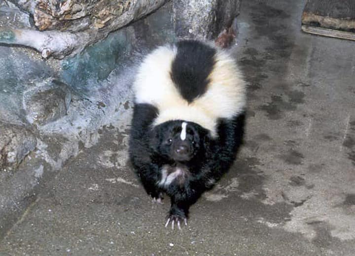 シマスカンクの分布域・生息環境 シマスカンクは北アメリカで普通に見かけられるスカンクで、北米の大部分に分布している。 アメリカ合衆国の太平洋側から大西洋側までとカナダのノーウエスト地方を省くほとんどの地方に分布していて、メキシコの北部まで幅広く見られる。 森林や低木林、草原などに生息しているが、湖畔林や河川林、耕作地周辺などにも生息していて、市街地近郊にも姿を見せる。 また、シマスカンクは低地から標高1800m辺りまでの山地にかけて生息しているが、標高4000mほどの高地でも観察されたとも言われている。 シマスカンクの大きさ・特徴 シマスカンクは分布域が広い為、いくつかの亜種が知られているが、体長は38~45cm、体重は0.7~6kg程だが、平均した体重は1.5~4kgほどと言われている。 体は雄の方が雌よりもやや大きいが、いずれもイエネコほどの大きさしかない。 しかし、全体にがっしりとした体つきをしていて、四肢は短いが5本の指がある。 爪は長くてよく目立ち、地面を掘ったりするのに役立っている。 また、肛門の付近に臭腺があり、敵に襲われると臭腺から強い匂いのする液体を噴出することがよく知られている。 シマスカンクの体毛はフサフサとしていて長いが、毛色には変化がある。 ふつうは黒いが、茶色を帯びた黒色や暗褐色をしているものなども見られ、時には灰色の毛色をしているものも見られる。 背中には頭頂から尾にかけて白い筋があるのがシマスカンクの特徴で、この筋は途中で2本に分かれ、尾の付け根近くで再び一本になっている。 また、顔にも白い筋があるが、筋の様子などにも個体差がある。 シマスカンクの生態・生活 シマスカンクは主に草地や森林に生息しているが、岩の多い藪地や農耕地、市街地など、多様な環境に適応していて、稀に標高4000mもの高地にも姿を見せることがあると言われている。 普段は単独で生活しているが、主として夜行性の動物で、昼間は木の根の洞や地面に掘った巣穴の中で休んでいて、夜になると活動をはじめることが多い。 また、巣穴は子育ての時以外は同じものを使わず、数日ごとに巣穴を変えると言われている。 行動範囲は環境や食糧事情などによって変化するが、3.5~5平方km程と言われている。 しかし、繁殖期以外は特に縄張り意識はないようで、互いの行動範囲はある程度重なっている。 シマスカンクは、主にバッタやコオロギなどの昆虫類やワーム類、ネズミなどの小動物、魚やその卵、カニなどの動物質のものを食べるが、果実や木の葉、穀類などの植物質も食べる。 普段はゆっくりと移動し、歩く時は蹠行性で、足裏を全部つけて歩く。 驚いた時や危険が迫った時の走る速さは時速15~16km程になるが、外敵に襲われると、逃げるよりも臭腺から噴出する液体で身を守ることも多い。 シマスカンクは身を守る行動として、肛門付近にある臭腺から強い匂いのする液体を噴出するが、この液体を噴き出す前には、背中を丸めて尾を垂直に立てて威嚇する。 それでも相手が怯まない場合は液体を噴きかけるが、液体には視覚や嗅覚を一時的に働かせなくする作用があり、時には失明させることもあると言われている。 この防御方法はかなり有効で、ボブキャットやコヨーテ、アカギツネなどの他、ピューマなどの大型動物にもほとんど襲われることはないと言われている。 嗅覚の鋭いオオカミなどもこの臭いを激しく嫌い、一度この臭いをかいだものは、スカンクの姿を見ただけで逃げ出すとも言われている。 また、シマスカンクが放つ液体は5~6m程にも達し、その強烈な臭いは、風向きによっては1km程も届き、体が小さいにもかかわらず、よく捕食者を退けている。 この他、シマスカンクは、クマのように冬眠はしないが、気温の低い時期には休眠状態になって冬ごもりすることが知られている。 暖かい日には活動するが、この時期には体重が大きく減り、中には30~50パーセントも体重を減らすものもいる。 シマスカンクの繁殖・寿命 シマスカンクは1年に一度繁殖し、ふつうは2~4月に繁殖のピークが見られる。 繁殖は一夫多妻で行われ、雄の中には複数の雌からなるハーレムをつくることもある。 巣穴は自ら掘ることもあるが、他の動物が使い終わったものを利用することもあり、雌は妊娠期間60~80日程で、1産2~12子、ふつうは5~6子を出産する。 生まれたばかりの子どもの体重は32~35g程で、目は開いていない。 生後3週間ほどで目が開くが、子育ては雌が単独で行い、雄が関わることはない。 子どもは6~7週程で離乳し、雌雄共に10ヵ月程で性成熟する。 この頃には親の元を離れて独立していくが、雌は翌年の春まで親と一緒にいることもある。 シマスカンクの飼育下での寿命は8~10年程度、野生では6~7年ほどと言われているが、野生下ではもっと短くなることも多い。 感染症などもあることから子どもの死亡率は高く、最初の1年を超すことができるものは少ないと言われている。 シマスカンクの保護状況・そ