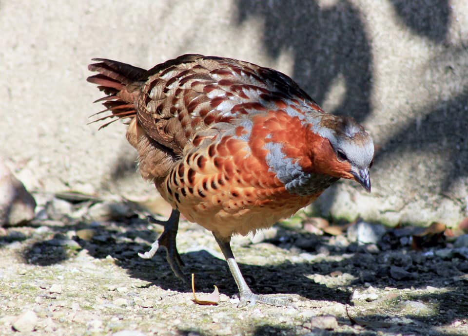コジュケイの分布域・生息環境 コジュケイは中国南部や台湾などに分布しているが、国内でも移入定着していて、ハワイやアルゼンチンなどでも導入されている。 低地から山地の森林や草地などの他、人里や耕作地周辺などでも見られ、時には町の中にも生息している。 コジュケイの大きさ・特徴 コジュケイは全長27~33cm程の小型のキジ類だが、ウズラよりはひと回りほど大きく、キジバトとムクドリの間ほどの大きさがある。 雄は雌よりもやや大きいが、雌雄共に全体に褐色で、濃淡のマダラ模様のようになっている。 腹部はオレンジ色っぽい色を帯びていて、暗褐色の斑がある。 また、眉斑と胸は灰色を帯びた青色で、頬から喉にかけては鮮やかな赤褐色の模様が見られる。 一見するとウズラに似ているが、ウズラの眉斑は白くてはっきりとしている。 コジュケイの生態・生活 コジュケイは国内では留鳥として見られるが、元来は外来種で、大正時代に狩猟の目的で移入されたものが定着している。 現在では普通種になっているが、コジュケイは寒さに弱いため東北地方南部が北限で、雪の多い日本海側には分布していない。 低地から山地の森林や草地、藪や耕作地周辺などに生息しているが、コジュケイは用心深く、鳴き声は時折聞かれるが、あまり姿を見せることはない。 採餌のため、早朝などに開けた場所に出てくるときなどに姿を見ることがあるが、羽毛の色は保護色にもなっていて、動かなければ見つけるのは難しい。 コジュケイは繁殖期はペアで縄張りをつくるが、普段は数羽から十羽程の群れで生活している。 地上性の鳥で、主に植物の芽や実、種子などを食べるが、雑食性で昆虫類やクモ類、ミミズなども食べる。 外敵はイタチやキツネ、タヌキなどのほか、大型の猛禽類に襲われることもある。 危険を感じると、多くのキジ類と同様、飛んで逃げるよりも素早く走って藪の中などに隠れる方が多い。 コジュケイの繁殖・寿命 コジュケイの繁殖期は主に5月~7月頃で、繁殖は一夫一婦で行われるが、雄は複数の雌と繁殖することもある。 巣は、地面を浅く掘って枯れ草などを用いてつくられ、雌は4~14個、多くは7~8個ほどの卵を産卵する。 抱卵は雌によって行われ、卵は18~21日前後で孵化し、ヒナは孵化直後から歩き回ることができる。 雌雄ともに1年ほどで成熟し、地域や条件などによっては、年に2回繁殖することもある。 また、コジュケイの寿命は飼育下で5~10年程度、野生下では2~5年程度と言われている。 コジュケイの保護状況・その他 コジュケイは個体数も多く、国内でもふつうに見られる。 中国では古くから家禽としても利用されていて、現在のところ、絶滅の恐れはないとされている。 また、コジュケイは小さい体にも関わらず大きな声で鳴くが、その声は「チョットコイ、チョットコイ」などのようにも聞こえるが、「ピッポッパ」などの様に鳴くこともある。 |