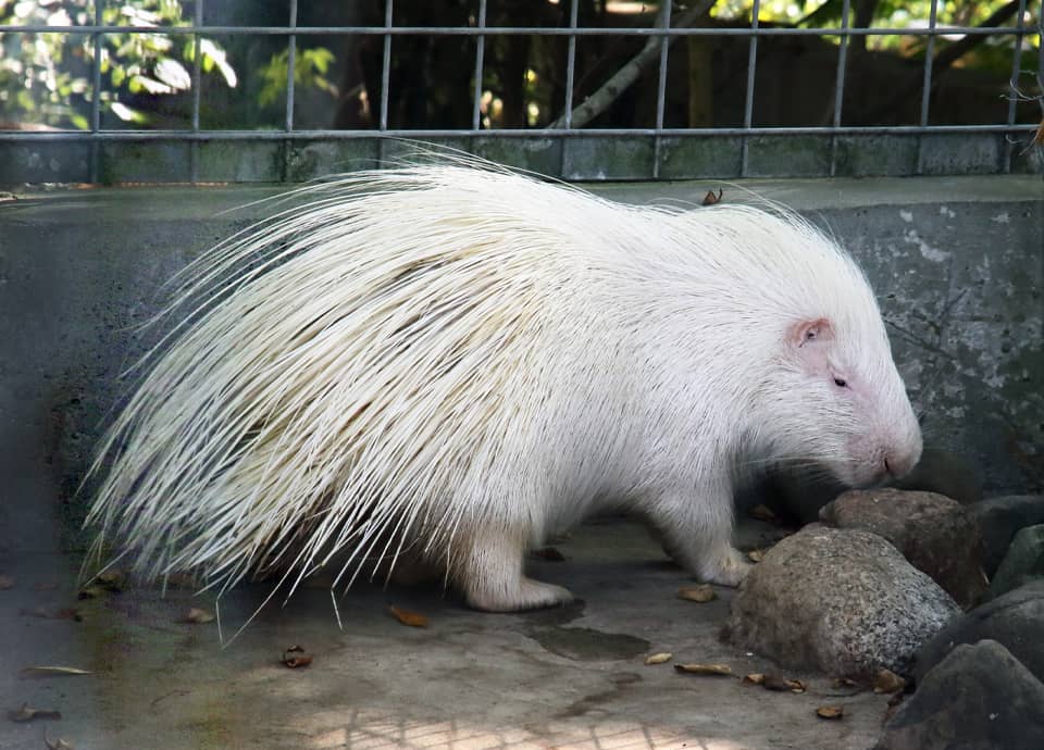 インドタテガミヤマアラシの分布域・生息環境 インドタテガミヤマアラシは、南アジアから中央アジアにかけて広く分布しているヤマアラシの仲間で、中東にも分布している。 バングラデシュからインドやネパール、ブータン、スリランカなどのほか、パキスタンからアフガニスタン、イラン、イラク、更にイエメンからサウジアラビア、トルコにかけても広く見られる。 岩の多い丘陵地帯に多いが、草原やサバンナ、森林や疎林、二次林などにも生息していて、さまざまな環境に適応している。 インドタテガミヤマアラシの大きさ・形態 インドタテガミヤマアラシは、体長70~90cmほどの大型の齧歯類で、平均した体重は11~18kg程にもなる。 四肢が短く、体はずんぐりとした感じだが、四肢は幅広く頑丈で、穴を掘るのに適した長い爪をもっている。 また、嗅覚は優れているが、目は小さくて視力はよくない。 毛色は茶褐色や暗褐色、黒褐色などで、首の下辺りに月の輪のような白い模様が見られるものが多い。 アフリカタテガミヤマアラシと同様、頭部から肩にかけての毛が長くタテガミ状になっているが、背中や尾の毛は針状に変化している。 この針は特徴のある黒白のまだら模様で、長いものは50cm程にもなるが、硬いが軽い。 針の表面は滑らかだが、僅かに返しがついていて、ものに刺さるとなかなか抜けない構造になっている。 一方、体からは抜けやすくなっているので、外敵などに対する有効な防御手段になっている。 尚、インドタテガミヤマアラシには時に白色変種が見られるが、その様な個体は全身が白く、針も色くなっている。 また、白色変種はタヌキやイノシシ、トラやライオンなど、さまざまな動物で見られる。 インドタテガミヤマアラシの生態・生活 インドタテガミヤマアラシは岩の多い丘陵地帯に多く見られるが、平地から山地にかけての草原やサバンナ、森林や二次林などにも生息している。 さまざまな環境に適応していて、ヒマラヤ山脈の標高2400メートル辺りでも見られる。 主として夜行性の動物で、昼間は地面に掘った穴や洞窟、岩の間や他の動物の古巣などで休んでいて、夕方から早朝にかけて活発に活動する。 ペアや家族単位の小さな群れで生活していて、主として草食性で、果物や穀類、木の根や球根などを食べるが、昆虫類やカエルなどの両生類なども食べる。 インドタテガミヤマアラシは季節によってあらゆる種類の植物を食べるが、時にミネラル補給のため、動物の骨を齧ったりもする。 採餌するときは食べ物を押さえたり掴んだりして、前肢をうまく使って食べる。 一方、農作物も好むことから、生息域の多くの地域では深刻な農業被害を与えている。 また、詳しい行動範囲などは分かっていないが、インドタテガミヤマアラシは巣穴の近くに留まる傾向があると言われていて、採餌も巣穴から遠く離れた場所で行われることはないと言われている。 外敵はカラカルやトラ、ライオンやシマハイエナ、オオカミやリカオンなどの他、時にイリエワニに襲われることもある。 尾の針は空洞状になっていて、外敵が近づくと、尾を振ってカラカラというような音を発して仲間に知らせると共に、うなり声をあげて相手に警告する。 相手が更に近づいてくると、後ろ向きになって針を逆立て威嚇するが、それでも相手がひるまないと、針を逆立てたまま後ろ向きに突進する。 この攻撃方法は効果的で、相手にとって致命的となることもあり、成獣のトラが肺と肝臓を刺されて死亡した例も報告されている。 その為、外敵は多いが、実際に襲われることは少ないと言われている。 この他、インドタテガミヤマアラシは嗅覚に優れ、木登りは得意ではないが、泳ぎはうまい。 インドタテガミヤマアラシの繁殖・寿命 インドタテガミヤマアラシの繁殖期は地域によって差があるが、主に2~3月頃に見られる。 繁殖は一夫一婦で行われ、その関係は生涯の間続くと言われている。 インドタテガミヤマアラシの巣は地面に穴を掘ってつくられるが、深さ1.5m、長さが18m程になるものもあり、2~3の出入り口が設けられている。 雌の妊娠期間は8ヵ月ほどで、1産2~4仔を出産する。 但し、遅延着床があるのか、雌の妊娠期間は4ヵ月程度とも言われていて、これについてははっきりしない。 生まれたばかりの子どもは体重500gほどで、目は既に開いている。 体も短くて柔らかい針で覆われているが、この針は数日の内には硬くなる。 離乳期間は13~19週ほどで、その後も性成熟する頃までは親と一緒に生活している。 雌雄ともに2年ほどで性成熟し、飼育下での寿命は27年を超えるものが知られているが、平均した寿命は20年程度と言われている。 野生下での寿命は分かっていないが、飼育下よりは短く、10~15年程度と考えられている。 インドタテガミヤマアラシの保護状況・その他 インドタテガミヤマアラシは分布域全体でよく見られ、現在のところ絶滅の恐れはないとされている。 農作物に被害を与