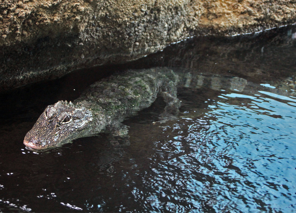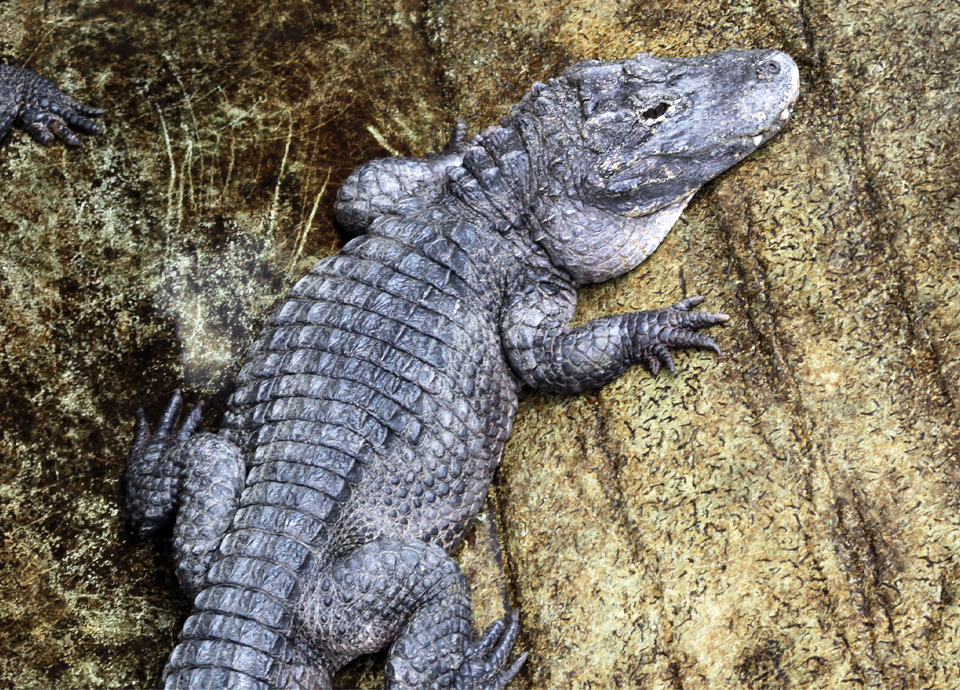 ヨウスコウワニの分布域・生息環境 ヨウスコウワニは、名前のように、揚子江(長江)下流域に生息する小型のワニで、安徽省や江蘇省、江西省、浙江省などに分布している。 国内ではヨウスコウアリゲーター、チョウコウワニなどとも呼ばれる中国の固有種で、温帯域に生息する現存する唯一のワニとして知られている。 また、ヨウスコウワニは、アリゲーター科の中では、唯一ユーラシア大陸に分布するワニとしても知られている。 ヨウスコウワニの大きさ・特徴 ヨウスコウワニは、全長1.5m程度、体重は35kg程の小型のワニで、同じアリゲーター属のミシシッピーワニ(アメリカアリゲーター)に比べるとかなり小さい。 吻は短くて、丸みを帯びていて、脊鱗板中央の2列は他に比べて高くなっている。 また、四肢の爪は鋭いが、前肢に水かきはなく、後肢に発達していない水掻きがあるのが特徴になっている。 体色は黒褐色や灰褐色のような色をしていて、子どもや若いものでは、黄褐色に黒い不規則な斑があるが、成長と共に不明瞭になる。 腹側は淡い褐色で白っぽく、大きいものは全長2.1m、体重45kg程に成長するが、普通はこれほどの大きさにはならない。 ヨウスコウワニの生態・生活 ヨウスコウワニは淡水性のワニで、低地の湖沼や河川、池や湿地帯などに生息していて、普段は単独で生活している。 主として夜間に活動し、貝類や魚類を主に食べるが、時に水鳥や小型の哺乳類なども食べる。 また、カメも食べるとも言われているほか、子どもは無脊椎動物や水生昆虫などを主に食べる。 しかし、性質はおとなしく、人を襲うようなことはない。 ヨウスコウワニは、10月下旬から翌年の4月中旬頃にかけての気温が下がる時期には、川底や川岸などに穴を掘って冬眠する。 巣穴は複雑なもので、複数のものを収容することができるようになっていて、ふつうは10~25m程の長さがある。 春になって巣穴から出てくると、自らの体温を上げるため、十分に太陽の光を浴び、やがて夜行性の生活に戻っていく。 外敵は、大型の魚や猛禽類などで、主に子どもや卵が狙われるが、時に薬用や皮を目的とした密猟も行われている。 しかし、皮下には皮骨が発達しているので加工が難しく、皮はあまり利用されることはない。 ヨウスコウワニの繁殖・寿命 ヨウスコウワニの繁殖期は6月頃で、繁殖は一夫多妻で行われる。 産卵は7月中頃で、雌は自分の巣の近くに産卵用の巣をつくる。 産卵用の巣は泥や植物などを使って塚状のものがつくられ、雌は一度に10~40個程の卵を産み、卵は植物などによって覆われる。 卵は70日程で孵化するが、その間、雌は巣を守る習性がある。 孵化がはじまると、雌は子どもの鳴き声に呼応して巣を覆う植物などを取り除き、子どもを水場へと連れて行くが、この時、雌は孵化を助ける為、ニシアフリカコビトワニなどのように、口内で軽く卵殻を噛み割って、孵化を助けるとも考えられている。 孵化したばかりの子どもの体重は30g、全長は21cm程度で、最初の冬を母親と過ごす。 また、生まれる子どもの性別は孵卵中の卵の温度によって左右され、温度が低いと雌が多く、温度が高いと雄が多く発生するとされている。 この温度差は、巣を覆う植物の量や、巣の中でどの深さに埋まっていたかなどによって生じてくる。 雌雄共に5~7年程で性成熟し、寿命は、野生下で50年、飼育下では70年程度と言われているが、平均するとこれよりは短く、20~40年と考えられている。 ヨウスコウワニの保護状況・その他 ヨウスコウワニは、古くは中国に広く分布していて、朝鮮半島にも生息していたとも言われている。 しかし、水田や耕作地の拡大などに伴なう生息地の減少に加え、貝類を探して水田に入り込だり、家禽を襲うことなどから害獣として駆除され、一時は絶滅寸前の状態まで追い込まれている。 その後、1960年代から中国政府による保護活動が行われ、飼育下での繁殖も行われて全体の個体数は増加したが、野生下のものは、現在も食用や薬用を目的とした密猟が行われているほか、農薬などによる環境汚染も懸念されたままになっている。 現在、ヨウスコウワニは国際自然保護連合(IUCN)のレッドリストで、もっとも絶滅の恐れがある絶滅危惧種(CR)に指定されているが、河川の改修や開発などによる、更なる生息地の減少などが心配されている。 尚、国内でも、大分県安心院盆地の鮮新世の地層からヨウスコウワニの化石が発見されている。 |