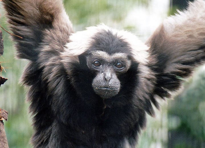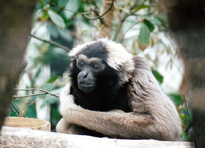 | ボウシテナガザルは、雌雄ともに頭の周りには長くて白い毛があるのが特徴になっている。 他のテナガザルと同様、密生した森林地帯に生息していて、主に果実類を食べている。