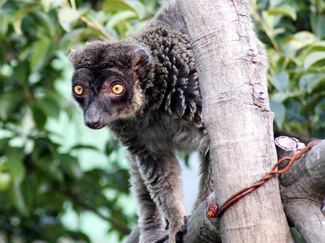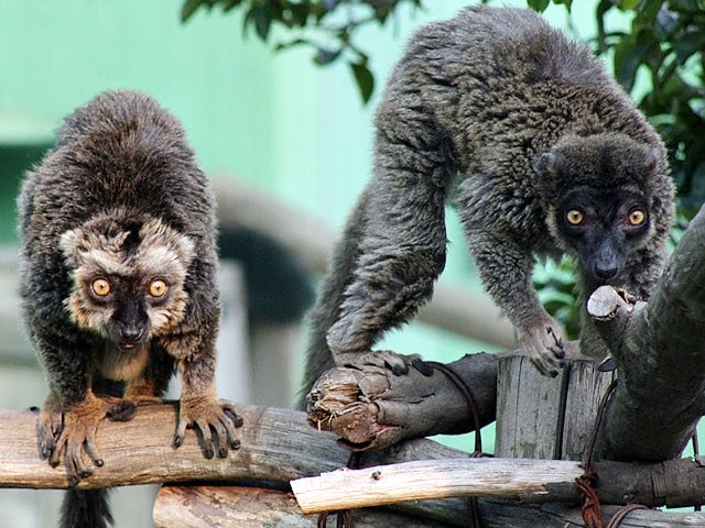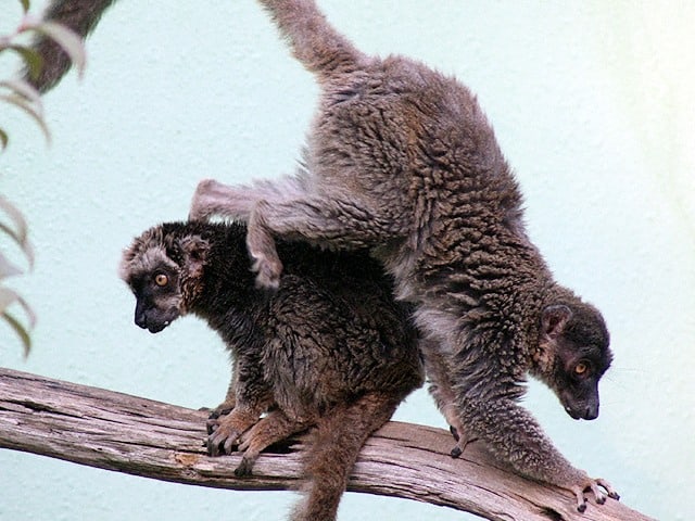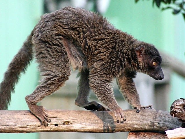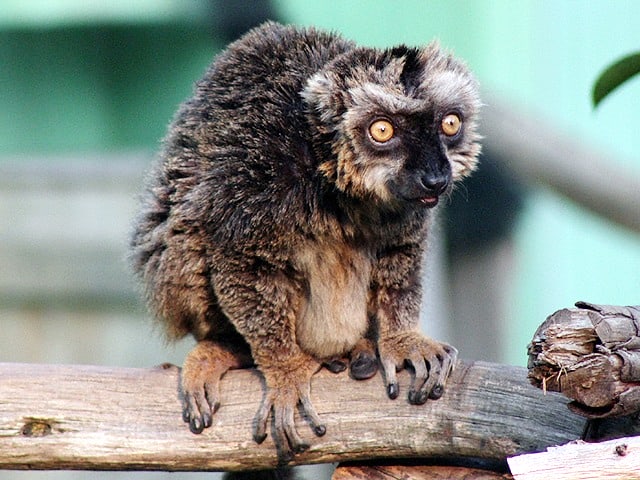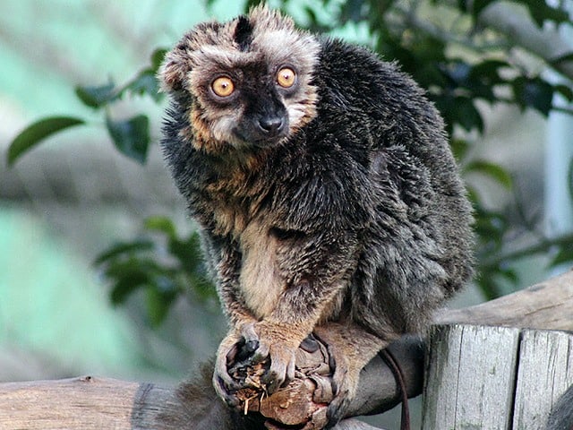 | ブラウンキツネザルはマダガスカル島北西部と北東部に分布しているキツネザルの仲間で、低地から山地にかけての森林に生息し、乾燥林や熱帯雨林など、様々な森林地帯で見られる。 毛は短いが密生していて、カッショクキツネザルやチャイロキツネザルなどの別名で呼ばれることもあり、雌雄共に毛色は褐色や灰褐色などをしている。 また、英名のままブラウンレムールと呼ばれることもあり、目は赤色の強いオレンジ色をしているほか、手首には臭い線をもっている。 ふつうは5~12頭程度の群れで生活しているが、多い時には30頭近くの群れをつくることもある。 また、群れには複数の雌雄と子どもたちが含まれているが、ブラウンキツネザルにははっきりとした階級はなく、他のキツネザルのように、雌の優位も見られないと言われている。 昼間に活動するが、乾季の間などは夜間も活動することがあり、他のキツネザルと同様、果実や木の葉、花などのほか、樹皮や樹液、昆虫類やクモ、鳥の卵なども食べる。 キツネザルの中でもワオキツネザルなどは地上で活動することも多いが、ブラウンキツネザルはほとんどの時間を樹上で過ごし、稀にしか地上に降りて来ない。 また、長くて太い尾は樹上でのバランスを取るのに役立っているが、跳躍力にも優れていて、樹間を巧みに移動することができる。 行動範囲は0.01~0.2k㎡程度と言われているが、群れの大きさや食糧事情などによって変化する。 一夫一婦制、或いは一夫多妻と言われているが、詳しい繁殖形態などは分かっていない。 繁殖期は5~6月頃に見られ、妊娠期間120日程で、1産1子、稀に2子を出産する。 子どもは生後3週間ほどの間は、母親の腹にしがみついているが、その後は背中に乗って移動するようになる。 4~6ヵ月程で離乳し、雌雄共に1年半から2年で性成熟する。 外敵はフォッサなどで、飼育下での寿命は30年、長いもので35年と言われているが、野生ではこれよりも短く、20~25年程度と考えられている。 ブラウンキツネザルはキツネザル属の中では最も広く生息していて、コモロのマヨット島にも導入されているが、近年では生息数が減少していて、国際自然保護連合(IUCN)では準絶滅危惧種(NT)に指定している。 尚、ブラウンキツネザルの仲間(ブラウンキツネザル属)には ・Eulemur fulvus (ブラウンキツネザル / Common Brown Lemur) ・E. sanfordi (サンフォードブラウンキツネザル / Sanford's brown lemur) ・E. albifrons (シロビタイキツネザル / White-headed lemu) ・E. rufus アカキツネザル / Red lemur) ・E. rufifrons (Red-fronted lemur) ・E. collaris (エリクビキツネザル / Collared brown Lemur) ・E. cinereiceps (Gray-headed lemur / 以前はシロエリクビキツネザル・E. albocollarisとされていた種) ・E. macaco (クロキツネザル / Black lemur) ・E. flavifrons (Sclater's lemur) ・E. coronatus (カンムリキツネザル / Crowned lemur) ・E. rubriventer (アカハラキツネザル / Red-bellied lemur) ・E. mongoz (マングースキツネザル / Mongoose lemur) などが知られているが、E. albifrons と E. rufus は、E. fulvus の亜種とすることもある。 キツネザル科の動物へ / このページの先頭へ |