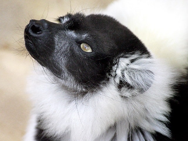 | エリマキキツネザルはマダガスカル島の熱帯多雨林だけに生息しているキツネザルの仲間で、キツネザルの中ではもっとも体が大きく、がっしりした感じがする。 クロシロエリマキキツネザル(本種/Varecia variegata)とアカエリマキキツネザル(Varecia rubra / Red Ruffed Lemur)の2種が知られているが、いずれも体色ははっきりと分かれている。 クロシロエリマキキツネザルの毛色は白と黒に分けられていて、顔のまわりには長いふさ毛がエリマキのように生えていて、これが名前の由来になっている。 また、アカエリマキキツネザルでは、クロシロエリマキキツネザルの白色の毛が赤茶色になっているが、両種共、いずれも体毛は長く、体全体を密に覆っている。 キツネのようにとがった鼻も特徴的で、嗅覚は鋭い。 本種・クロシロエリマキキツネザルはマダガスカル島東部の湿度の高い常緑樹林に生息していて、ほとんど樹上生活をしている。 標高1300m辺りまで生息していて、ふつうは2~5頭程の家族単位の小さな群れで暮らしているが、時には10~16頭程の群れも見られる。 昼間に行動するが、特に朝方や夕方には活発に活動し、樹間や枝から枝へと敏捷に動きまわる。 行動範囲は食料事情などによって幅があり、0.15~2k㎡と大きく変化するとされている。 樹冠近くで主に果実類を採食するが、木の葉や花なども食べる。 手は親指と他の指が対向していて、木の枝や物をつかむことができるが、採食するときにはあまり手を使わず、直接口で食べることが多い。 また、いくつかの地域では、地上に降りて菌類や土壌を食べることも観察されている。 土を食べることはワオキツネザルなどでも観察されているが、これはナトリウムの摂取量を増やすためだと考えられていて、土壌に含まれている塩分を摂取していると言われている。 しばしば群れ全体で大きな鳴き声をあげるが、その鳴き声は一頭だけでもかなり遠くまで聞こえる。 この鳴き声は動物園などでもよく聞くが、縄張りを示すものだと考えられている。 繁殖は6~7月頃に見られ、一夫一婦と言われているが、一夫多妻であるのではないかとも考えられている。 妊娠期間は90~102日程で、1産2~6子、普通は2~3子を出産する。 キツネザルは原始的なサルだが、エリマキキツネザルはサルにしてはめずらしく樹上に簡単な巣を作り、そこで子育てを行う習性がある。 また、キツネザルの仲間は、菜食に出かけるときなどは子どもを一緒に連れて行くが、エリマキキツネザルだけは子どもを巣において採食に出かけると言われている。 子どもには半年ほどの授乳期間があり、雌雄共に2年程で性成熟する。 野生での寿命は20年程度と言われているが、飼育下では30年を超えるものも知られている。 外敵はフォッサなどだが、近年では森林伐採などの影響で、キツネザルの仲間の生息数は減少している。 エリマキキツネザルも同様で、生息地も分断されてしまい、生息数はかなり減少している。 現在、クロシロエリマキキツネザルには下の3亜種が知られているが、いずれも生息数が少なく、国際自然保護連合(IUCN)の保存状況評価によって絶滅危惧種・CRとして保護されている状況になってしまっている。