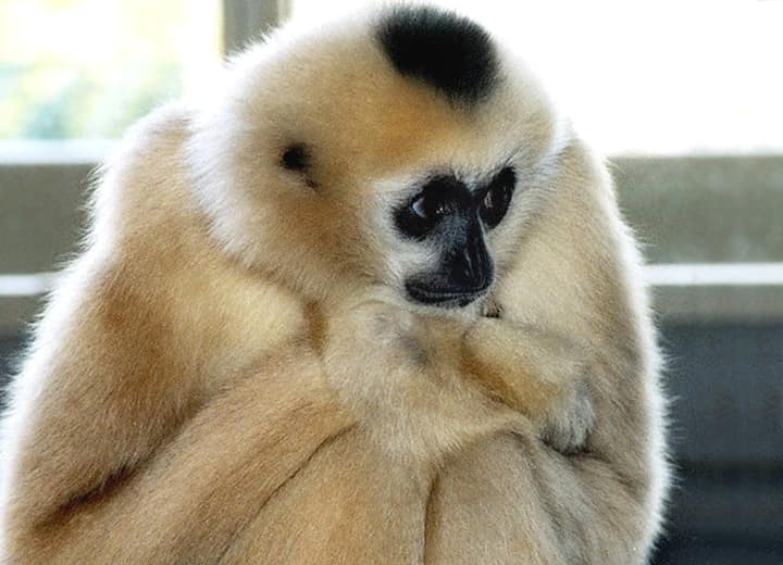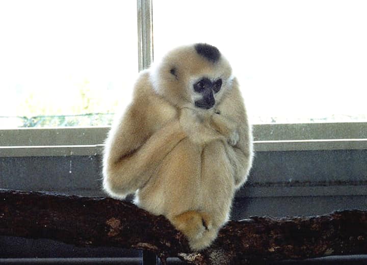 コンカラーテナガザルの分布域・生息環境 テナガザルの仲間は東南アジアなどに分布しているが、コンカラーテナガザルはラオス北西部やベトナム北部、中国南西部の雲南省などに分布していて、それぞれの国境が接するシャン高原、ユンコイ高原などの山地に生息している。 主に標高2000m辺りの高地の森林地帯に生息しているが、標高600~2600m辺りまで観察されている。 コンカラーテナガザルの大きさ・特徴 コンカラーテナガザルは体長45~55cm、体重7~10kg程で、他のテナガザルのように腕は長く、尾は痕跡程度しかない。 一見して、テナガザルの中ではよく見られるシロテテナガサルに似ているが、毛色は雌雄で異なっているのが特徴になっている。 雄は全身が黒い色をしていることから、別名・クロテナガザルとも呼ばれているが、雌は全身が淡いクリーム色をしていて、頭頂部や目や鼻の周り、口などは黒っぽい色をしている。 また、雄の中には頬の部分が白く、頬ひげを生やしたように見えるものも見られる。 しかし、コンカラーテナガザルの頭頂部はいずれも黒く、帽子をかぶったように見える。 その様子から本種を「ボウシテナガザル」と呼んだりもするが、ボウシテナガザルとは別種である。 コンカラーテナガザルの生態・生活 コンカラーテナガザルは森林地帯に生息していて、常緑林から落葉林まで見られる。 比較的標高の高いところに多く、中国では標高2500mを超える高地でも姿が観察されている。 昼間に活動し、雌雄とその子どもからなる小さな家族単位で生活している。 地上に降りてくることはほとんどになく、主に森林の樹冠部分で生活している。 樹上では、雲梯(うんてい)を渡るように、長い腕と体の反動を使ったブラキエーションと呼ばれる運動で、枝から枝へと敏捷に移動する。 木登りや跳躍にも優れていて、かなりの距離を跳ぶこともできる。 主に果実や木の葉、木の芽などを食べ、季節によってさまざまなものを食べる。 また、コンカラーテナガザルは動物質のものを食べないと言われているが、昆虫や小鳥の卵、カエルやカタツムリなどの動物質も好んで食べるとも言われている。 行動範囲は季節や食糧事情などによって幅があるが、平均すると0.1~0.2平方km程度と言われている。 行動範囲は縄張りにもつながっていて、大きな声をあげたりして縄張りを主張する。 鳴き声は早朝や夕方に多く聞かれるが、その声は辺りによく響き渡る。 この鳴き声は縄張りを主張しているだけでなく、群れの繋がりを確認するためにも行われている。 夜間は背の高い木の上で休むが、同じ木を選ぶこともあり、違った木で休むこともある。 同じ木で休む場合は、その木の同じ場所で休む習性があると言われている。 また、一見おとなしそうに見えるが、コンカラーテナガザルは性質は荒く、攻撃性が強いとも言われている。 外敵はヒョウやウンピョウ、大型のヘビなどが考えられているが、具体的な外敵は知られていない。 コンカラーテナガザルは樹上の高いところで生活していることもあり、外敵は少ないとも考えられている。 コンカラーテナガザルの繁殖・寿命 コンカラーテナガザルには決まった繁殖期がなく、1年を通して繁殖することができる。 また、繁殖は一夫一婦と言われているが、テナガザルの中では珍しく、時に一夫多妻であることも観察されている。 雌は2~3年の間に一度出産し、妊娠期間7~8ヶ月の後、ふつうは1産1子を出産する。 生まれたばかりの子どもの体重は500g程で、育児は雄やほかの家族によっても行われる。 子どもは2年ほどで親から離れて自立した生活を送るようになり、雌雄共に7~8年程で性成熟し、雄はこの頃には群れを離れていく。 雌もやがては群れを離れていくが、しばらくは出生した群れに留まっていることもある。 野生下での詳しい寿命は分かっていないが、他のテナガザルなどと同様、飼育下では25~30年ほどの寿命があると考えられている。 また、子どもの毛色は雌雄共にベージュ色をしているが、半年ほどで全身が黒っぽくなっていく。 しかし、雄は成長しても黒いままだが、雌は成熟する前には再びベージュ色に変わっていく。 コンカラーテナガザルの保護状況・その他 コンカラーテナガザルは、近年の森林の伐採や開発などで、生息数が激減している。 現在は国際自然保護連合(IUCN)の保存状況評価によって、もっとも生息数が少ないと懸念される絶滅危惧種(CR)としてレッドリストに指定されている。 しかし、分布域が限られていて、生息地も分断されていることもあり、更なる生息数の減少が心配されている。 尚、コンカラーテナガザルには次の亜種が認識されている。 Nomascus concolor concolor (Tonkin black crested gibbon) ベトナム北部から中国雲南省南部に分布する基亜種 N. c. furvogaster (West Yunnan black crested gibbon) 雲南省南西部のビルマ国境付近 N, c, jingdongensis (Central Yunnan black crested gibbon) 中国雲南省中央部 N. c. lu (Laotian black crested gibbon) ラオス北西部に分布 ま