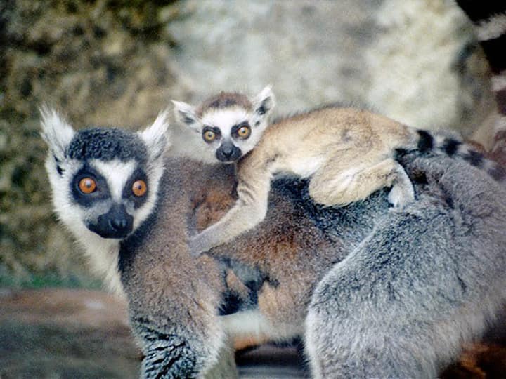 ワオキツネザルの分布域・生息環境 ワオキツネザルはマダガスカル島南部や南西部に分布していて、あまり深くない森林や疎林、森林近くの乾燥した地域などに生息している。 ほかのキツネザルよりも分布域が広く、低地から標高2600m辺りまで見られ、垂直方向の分布域も広い。 ワオキツネザルの大きさ・形態 ワオキツネザルは体長40~45cm程度、平均した体重は2.2~2.5kg程で、尾は体長よりも長く、55~63cm程の長さがある。 四肢には5本の指があり、後肢の第2指は鉤爪をしているが、他はすべて平爪で、他のキツネザルと同様、後肢は前肢よりも長くなっている。 体毛は密生していて、毛色は、背面は灰色や灰褐色などで、顔や腹面は白っぽいが、目の周りは黒い色をしている。 耳は大きくて白い毛が生えていて、目の色は金色で、鼻には毛がなくて黒い色をしている。 尾は長く、フサフサとした毛に覆われているが、この尾は黒と白の輪の模様になっているのが特徴で、ほかのキツネザルとの見分けが容易にできる。 また、尾の先は黒色で終わるが、ワオキツネザルの名前は、この特徴的な尾(輪尾)から付けられている。 ワオキツネザルの生態・生活 ワオキツネザルは、ふつうは低地や丘陵地帯の森林で見られるが、一部のものは標高2500mを超える岩の多い高地にも生息していて、キツネザルの中でも、もっとも多様な環境に適応している。 昼間に行動し、同数程度の雌雄とその子どもからなる5~20頭ほどの群れで暮らしていて、強い社会性がある生活をおくっている。 群れは母子を中心とした母系集団で、群れの中での順位は、雌の方がすべての雄よりも優位になっている。 同性間でも優劣が見られ、特に雌の間では順位がはっきりとしている。 しかし、もっとも優位な雄よりも、もっとも劣位の雌の方が優位にある。 一方、雄の間の順位はそれほど明確でなく、雄は2~5年程で別の群れに移っていく。 また、群れの数が多すぎるようになったり、食料が不足したりすると、群れは分散して、バランスをとるようにしている。 主に果実や木の葉、花などを採餌するが、昆虫やクモ類、カメレオンなどの小動物も捕らえ、夜間は樹の上で数頭ほどがかたまって眠る。 また、食べ物は生息地や季節などによって異なるが、ワオキツネザルは土を食べることが知られている。 これはナトリウムの摂取量を増やすためだと考えられていて、土壌に含まれている塩分を摂取していると言われている。 行動範囲は食糧事情や群れの大きさなどによって変化するが、食糧の豊富なところでは0.06~0.08平方km、そうでないところでは0.23平方km程度と考えられている。 また、行動範囲は縄張りにも結び付いているが、群れ同士の縄張りが重なったりした場合、これを巡って争いがある。 ワオキツネザルは元来は樹上性で、樹の上での動きは敏捷で、活発に動き回る。 しかし、キツネザルの中では地上で生活する時間が一番長く、より地上性が強い。 動物園などでも、ワオキツネザルが樹上から降りてきて、地上を歩く様子がしばしば見られる。 遠くへ移動するときなどは、樹間を移動するよりも地上に降りることが多く、歩く時は長い尾を高く上げて移動する。 地上では岩の多い乾いたところを歩きまわるが、跳躍力があるため、歩くというよりも、幾分跳ねるような感じで移動する。 また、ワオキツネザルは二足歩行することも知られているが、この時も、少し体を横に向けたような格好で、両手を上げてピョンピョンと飛び跳ねて移動する。 走る速さは時速20km程と言われているが、跳ねるように移動するので、実際はもっと速いようにも思われる。 水を飲むときには、イヌのように舌でピチャピチャと舐めるようにするほか、しばしば太陽に向かって、四肢を広げて日光浴する様子が見られる。 これは体温調整をするためで、寒い季節などにはよく行われ、その様子も動物園などでよく見かけられる。 また、ワオキツネザルの前足の手首には臭いを出す特殊な分泌腺があり、この分泌液を樹木のほか、尾などにこすり付ける習性がある。 この行動は、尾を再び木の枝などにこすり付けてマーキングし、縄張りを示すためであると考えられている。 尾に臭いをこすりつけた後、尾を頭上まで上げて左右に振りかざしたりする様子も見られるが、これも臭いを周囲に撒き散らして、縄張りの主張や群れの中での順位などを示すためだと言われている。 仲間同士は臭いや鳴き声などでコミュニケーションをとっているが、鳴き声は大きく、1km先にも聞こえるほど大きい。 外敵にはフォッサのほか、フクロウやタカなどの猛禽類が挙げられるが、地上にいるときにはイヌなどに襲われることもある。 ワオキツネザルの繁殖・寿命 ワオキツネザルの繁殖期は4月中旬から6月頃にかけて見られ、繁殖は一夫多妻で行われる。 雌は4~4ヵ月半程の妊娠期間の後、1産1~2子、ふつうは1子を出産する。 生まれたばかりの子どもの体重は50~80g程度で、育児は雌によっ