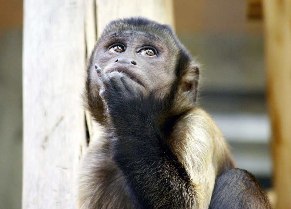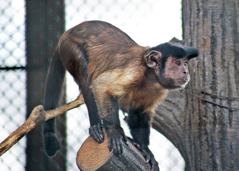 フサオマキザルの分布域・生息環境 フサオマキザルは南米のコロンビア西部からベネズエラ南部を経てガイアナ、スリナム、仏領ギアナのほか、ブラジル北西部などに分布している。 湿潤な亜熱帯林や熱帯林に生息しているが、乾燥林や二次林などにも生息している。 フサオマキザルの大きさ・形態 フサオマキザルは体重2~4kg程で、体は雄の方が大きい。 大きい雄では、体重が4.5kgを超えるものも見られ、雌雄ともに、オマキザルの中ではがっしりとした体格をしている。 体毛は厚くてふかい毛をしていて、毛色は褐色をしているが、黒っぽいものや淡い色のものも見られ変化がある。 また、体に比べて、四肢や尾は暗褐色などで黒っぽい色をしている。 顔は黒っぽくて毛がなく、名前のように、頭部にはフサのような盛り上がった毛が見られるのが特徴になっている。 この盛り上がったフサ毛は成熟した雄でははっきりとしているが、雌や子どもなどではあまりはっきりとはしていない。 また、フサオマキザルにはいくつかの亜種が知られていて、種類によってはフサ毛が耳の上に突き出しているようなものも見られるほか、個体によっても違いが見られ、逆三角形をしているものなど、フサ毛の形にはかなり変化が多い。 四肢には5本の指があり、爪はすべて平爪をしていて、後足で物をつかむこともできる。 尾は長く、先にまで毛が生えていて、樹上でのバランスをとるのに役立っている。 また、犬歯はかなり大きく、採餌しているときなどにはよく見える。 フサオマキザルの生態・生活 フサオマキザルは亜熱帯や熱帯の森林に生息しているが、乾いた森林や二次林、海岸近くの林などにも生息していて、標高1000m程の山地の森林にも生息している。 地上に降りることもあるが、主として樹上性で、樹木の中層から下層で生活していて、夜間も樹上で眠る。 普通は8~10頭、多くて15頭ほどの群れで生活し、時にはタマリンやクモザルの群れと一緒にいることもある。 群れは複数の雌雄とその子どもからなる家族単位で、成獣の雄が優位を占め、その次には優位な雌が続く。 この為、雄の中には優位な雌よりも順位の低い雄も見られる。 平均的な行動範囲は8~9平方kmと言われているが、1.25~2.5平方km程度のようなこともあり、行動範囲は生息する地域の食糧事情などによって大きく異なる。 また、行動範囲は縄張りの範囲にもつながるが、縄張りの主張は尿を掌につけて、それを更に足の裏や体にこすりつけ、通った跡に臭いをつけるなどして行われる。 フサオマキザルは日の出とともに活動し、採食に出かけるが、先頭のリーダーが枝を渡っていくと、ほかのものはその同じあとに続いていく。 主に果実を食べるが、木の実や木の根、茎などのほか、昆虫や爬虫類、両生類や鳥、その卵などの動物質も食べ、川にいるカニなどの甲殻類も食べる。 また、食料が少ないような場合は、群れの中の優位な雄が優先権を持っていて、順次劣位のものへと採餌が行われる。 フサオマキザルはかなり賢いサルで、 ネズミの尻尾を持って、手の届かないところのエサをとらせた例や、野生ではコモンマーモセットを養育した報告もされていて、新大陸のサルでは最も知能が高いと考えられている。 採食時においても、木を叩いて中にいる昆虫の有無などを調べたりすることなどが知られているが、フサオマキザルは簡単な道具なら使うこともできる。 特に、硬い木の実を割るのに石を用いることが知られているが、叩き割る石だけでなく、木の実を割る石の台も選び、これらをうまく使って殻を割る。 この時、叩き割る石を頭の高さほどにも持ち上げ、自分の体重をかけて木の実を割るようにするが、これには高い知能が必要とされている。 更に、大きいヤシの実などを割るときなどは、両手で抱えて、台になる石のところまで二足歩行で運んでいったりもする。 主な外敵はワシやタカなどの猛禽類が知られているが、大型のヘビやジャガー、ピューマなどに襲われることもある。 危険が迫ると大きな鳴き声をあげ、群れの仲間に警告するが、特に猛禽類に対しては警戒心が強いと言われている。 このほか、フサオマキザルは子どもの時から飼育するとよく馴れ、芸を覚えたりもするが、完全に成長すると体も大きくなり、顎の力が強く、犬歯も鋭いので危険でもある。 フサオマキザルの繁殖・寿命 フサオマキザルには決まった繁殖期は見られないが、出産は乾季や雨季の早い時期に多く見られる。 繁殖は一夫多妻で行われるが、雌は優位な雄と優先的に繁殖すると言われている。 雌の妊娠期間は150~180日程で、ふつうは1産1子を出産するが、稀に2子を出産する。 生まれたばかりの子どもの体重は200~250g程で、生まれると自分で母親の背中にしがみつき、授乳時には胸に抱かれる。 子どもは数ヵ月程の間は母親の背中に乗って育てられるが、親と離れているときなどは、他の仲間が面倒を見る。 授乳期間は1年半ほどで、雌は4年程で