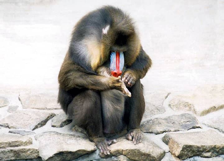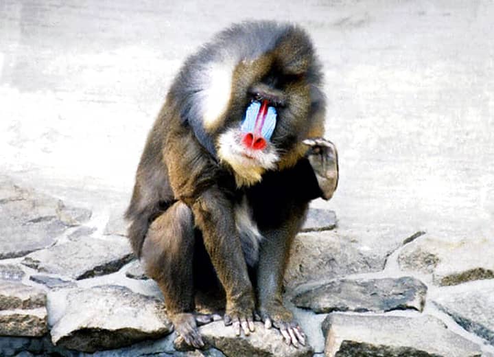 マンドリルの分布域・生息環境 マンドリルはアフリカ西部の赤道ギニアやガボン西部、カメルーン南西部、コンゴ共和国南西部の一部などに分布している。 低地から丘陵地帯などにかけての熱帯雨林や二次林、低木林などに生息しているが、時にはサバンナ地帯で見られることもある。 マンドリルの大きさ・特徴 マンドリルは、外見はヒヒに似ていて、以前はヒヒ属とされていたが、現在はドリルと共にマンドリル属を構成していて、ヒヒ属よりも、ゴールデンマンガベーなどが属しているシロエリマンガベー属に近いと考えられている。 オナガザルなどの中ではもっとも体が大きいと言われていて、平均した体長は雌で56cm、雄は80cmほどにも成長する。 平均した体重は雌で12kg程度なのに対して、雄では25kg、中には54kg程に達するものも見られ、体は雄の方がかなり大きい。 また、雄の体つきはドリルのようにがっしりとして引き締まっていて、アヌビスヒヒなどと共にもっとも体重があり、力も強い。 一方、雌はかなり小さくてほっそりとした感じがするが、雌雄いずれも、四肢で立つと肩のほうが腰よりもやや高くなっている。 また、マンドリルにはニホンザルのように頬袋があり、食べ物を一時の間蓄えておくことができるが、頬袋には胃一杯分に近い量の食物を収容することができると言われている。 マンドリルの一番の特徴は顔の様子で、雄では長い鼻面に6本の隆起があり、上部が青色、溝の部分は赤紫色と、かなり目立つ色合いをしている。 鼻孔のまわりも真っ赤な色をしていて、臀部も紫がかっている。 これに対して、雌や子どもは雄よりも色が鮮やかでなく、地味な色をしているが、いずれにしてもマンドリルはかなり特徴的な顔つきをしている。 この鮮やかな色は離れていてもよく目立ち、森林の中で群れ同士を認識するのに役立っているのではないかと考えられている。 毛色は黄褐色や褐色、オリーブ色などで、腹部は白色や黄色っぽく、雄のひげは白っぽい色をしている。 また、ドリルの仲間はヒヒに比べると尾が短く、マンドリルの尾もとても短く、歩くときには立てている。 マンドリルの生態・生活 マンドリルは森林地帯に生息していて、普通は1頭の雄と複数の雌などからなる10頭程のハーレム的な群れをつくって生活しているが、複数の雌雄とその子どもからなる10~40頭程の群れなども見られる。 また、しばしば群れ同士が集まって、200頭、或いはそれ以上を超える大きな群れをつくることもあり、600~800頭ほどになることもあると言われている。 マンドリルの群れには、雌雄ともにはっきりとした階級構造があり、雄では体が大きく、力も強いものが優位になっている。 この優位な雄は、顔や臀部などの色がより鮮やかになっているが、これらの色は、群れの中の地位によって変化するとされていて、劣位な雄は鮮やかさに欠けると言われている。 雌の場合、ふつうは成熟した年長のものが優位で、その姉妹や子どもなども、他の雌よりも優位にあると考えられている。 その為、マンドリルの雌の階層は血縁関係にある母系であり、群れ全体も母系とも言える。 マンドリルは森林地帯に生息しているので木登りはとてもうまいが、主に地上生活をしていて、日中は森林内よりも開けた丘陵や岩場などで過ごすことも多い。 地上を移動するときは四肢を使って歩くが、樹木の上ではジャンプして、横に移動することが多い。 採餌も地上で行うことが多く、採餌する時は、雌や子ども、若いものなどがグループをつくって行うが、成熟した雄は単独か、雄同士の小さなグループをつくって行われる。 主に果実や木の実、キノコ類などを食べるが、マンドリルは雑食性の動物で、岩をひっくり返して昆虫類やトカゲ、ヘビなどを探し出したり、時にはネズミなどの小動物、鳥やその卵、カメなども食べる。 また、マンドリルは時折土や粘土などを食べるが、これはミネラルを補給し、特定の果物に含まれる毒素を中和していると考えられている。 行動範囲は5~50平方km程度と考えられているが、群れの大きさや食糧事情によって幅がある。 性質は荒いと言われていて、相手を威嚇するときには、大きく口を開けて牙を見せ、地面を激しく叩く。 牙は雌雄共にもっているが、雌では1cm程度と短いが、雄では長く、平均で4.5cm程の長さがある。 この犬歯はヒョウにも匹敵すると言われるほど強力で、時にはヒョウに向かっていくこともある。 また、外敵にはヒョウのほか、大型のアフリカニシキヘビや、子どもはワシなどの猛禽類に襲われることもある。 夜間は天敵を避けるため木の高いところで休むが、マンドリルは特定の巣はつくらず、毎回違った場所の樹上で休むと言われている。 マンドリルの繁殖・寿命 マンドリルには決まった繁殖期が見られないと言われているが、繁殖は7~10月頃に多く見られる。 繁殖は一夫多妻で行われ、雌も複数の雄と交尾する。 雌は妊娠期間およそ167~176日程の後、ふ