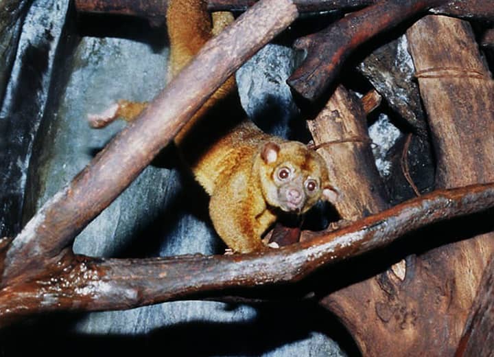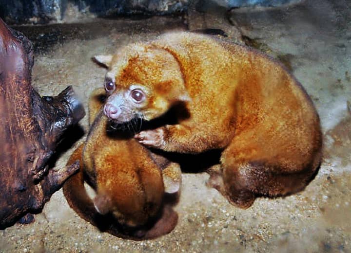 | キンカジューはアライグマ科の動物で、中央アメリカや南アメリカなどに分布している。 完全な夜行性で、夕暮れ時から活動をはじめ、果実類を主に食べている。