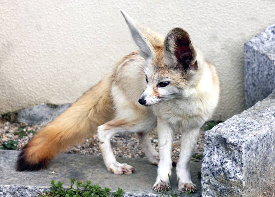 フェネックの分布域・生息環境 フェネックはモーリタニアからモロッコ、アルジェリアなどを経て、エジプトやスーダン北部など、サハラ砂漠を含む北アフリカやシナイ半島などに分布している。 厳しい環境に生息していて、イネ科やスゲ科の植物や低木などがまばらに生える砂漠地帯や砂地の乾燥地帯に生息しているが、山岳地帯で見られることもある。 フェネックの大きさ・特徴 フェネックは体長30~40cm、体重0.8~1.5kg程で、イヌ科のなかでは最小の動物と言われている。 雄の方が体は大きいが、それでも肩高は18~20cm程しかなく、イエネコか、或いはそれよりも小さい。 フェネックの特徴はその大きな耳で、離れていてもかなり目立つ。 体はイヌ科の中では最小であるにも関わらず、耳は10~15cm程もあり、イヌ科の中では最も大きくなっている。 この大きな耳は、砂漠地帯で生活するフェネックにとって、体熱を放射するのに役立っていると考えられているが、聴力にも優れていて、砂の中に潜んでいる獲物を探し出すことにも役立っている。 また、 この大きな耳から、フェネックは一見してオオミミギツネと間違われやすいが、分布域も違い、オオミミギツネの鼻面や四肢は黒っぽい色をしている。 フェネックの毛は柔らかく、フサフサとした毛が全身に密生している。 毛色はふつう背面が赤みを帯びたようなクリーム色で腹部は白っぽいが、ほとんど全身が白いようなものも見られる。 また、尾もフサフサとしていて、先は黒い色をしている。 足の裏にも長くてやわらかい毛が密生していて、温度差の激しい砂漠地帯を移動するのに適している。 フェネックの生態・生活 フェネックは人の生活圏から離れた砂漠地帯や乾燥した砂地などに生息していて、ふつうは10頭くらいまでの家族単位で生活している。 多くは雌雄のペアとその子ども、幼獣たちから構成されているが、日中は暑さを避けるため巣穴で休み、早朝や夕方時の涼しい時間に活動する。 また、フェネックは主に夜行性とも言えるが、砂漠地帯では夜間になるとかなり気温が下がる為、一日の大半を巣穴の中で過ごしていることが多いとも言われている。 フェネックは穴掘りがうまく、巣穴は120平方m程の広さになるとも言われている。 巣穴は砂漠にある茂みなどに掘られ、出入口は幾つか設けられている。 巣の中は複雑に延びていて、時には他の家族群の巣穴と繋がっていたりして、多くのものが同棲するように棲んでいることもある。 詳しい行動範囲は知られていないが、行動範囲は縄張りにも結び付いていて、糞や尿でマーキングされている。 フェネックは小型の囓歯類やウサギ、鳥や爬虫類、昆虫類などを食べるが、果実や葉など、利用できる様々なものを食べる。 特に、葉や根、果実などの植物質は、水分の少ない生息地での大切な食料源になっている。 水があれば利用するが、フェネックは乾燥した砂漠地帯で生活するのに適した体になっていて、生活に必要な水分のほとんどを植物から摂取し、水を飲まなくても生活していくことができるとも言われている。 また、フェネックは敏捷に動き回るが、跳躍力にもすぐれ、70cm近くも垂直に跳び上がることができ、立ち位置からでも1m以上の距離を跳ぶこともできる。 小さい体にもかかわらず走るのも速く、獲物を追うときなどの走る速度は、時速30~35kmほどにもなる。 外敵はフクロウやワシミミズクなどの猛禽類が知られているが、カラカルやジャッカル、シマハイエナなどにも襲われることがあると言われている。 しかし、フェネックは聴力に優れていて、いち早く外敵の迫ってくることを察知して、巣穴などに逃げ込んでしまう。 毛色は保護色にもなっていて、捕らえるのはかなり困難とされている。 また、巣穴には脱出用の出口も設けられていて、猛禽類のほかは主な外敵はいないとも考えられている。 フェネックの繁殖・寿命 フェネックの繁殖期は冬季の1~2月頃に多く見られ、繁殖は一夫一婦で行われる。 ペアの関係は生涯続くとも言われていて、雌は平均した妊娠期間50~53日程で、1産1~6子、ふつうは2~4子を出産する。 生まれたばかりの子どもの体重は50g程で、目は閉じている。 10日から2週間程で目は開くが、雌はその間は子どもと一緒に巣穴で過ごしている。 また、雄は雌に食べ物を運んでくるなど、子育ては雌雄によって共同で行われる。 子どもは3ヵ月頃までには完全に離乳し、早ければ雌雄共に6ヵ月、遅くても9か月ほどで性成熟する。 フェネックの野生での寿命は、長いもので10年程度と考えられている。 一方、動物園などの飼育下での寿命は14年を超えたものも知られている。 フェネックの保護状況・その他 フェネックは、現在のところ個体数は安定していて、絶滅の恐れはないとされている。 しかし、毛皮を目的とした狩猟やペット取引のための捕獲などが行われていて、ワシントン条約では付属書IIに記されている。 また、近年では開発などによって生息地が減少し