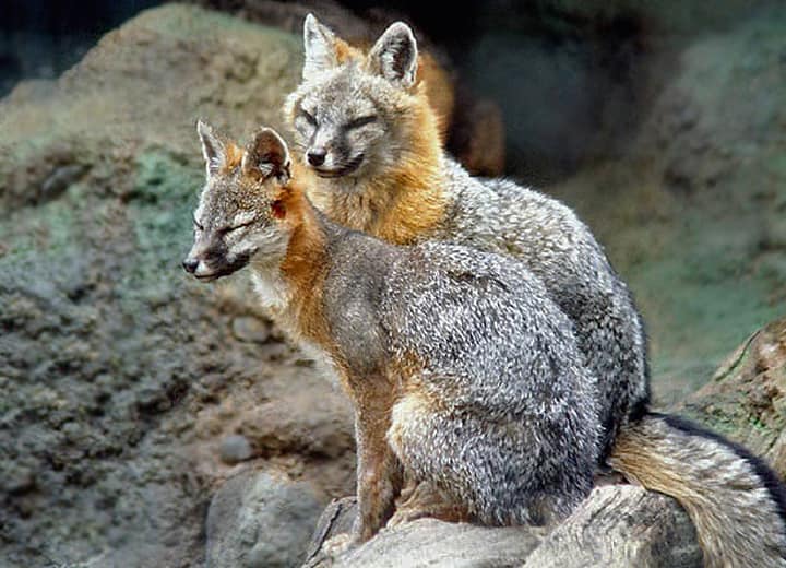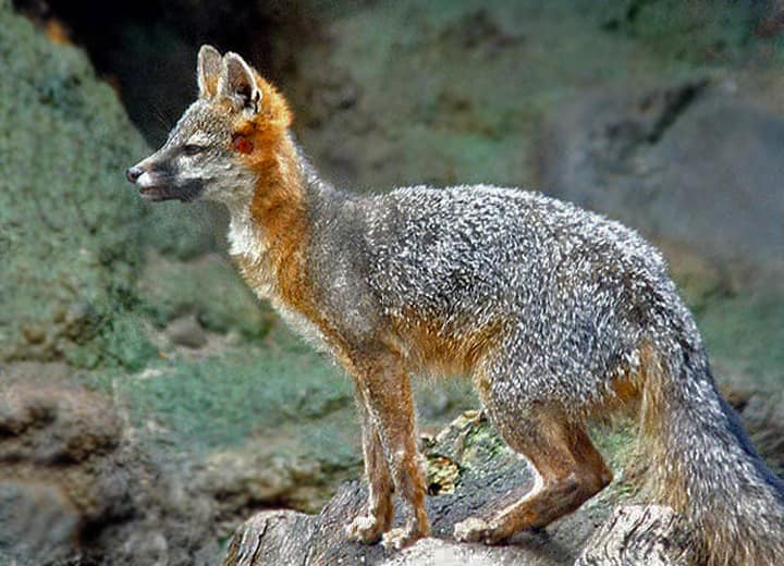ハイイロギツネの分布域・生息環境 ハイイロギツネは、カナダ南部からメキシコを経て南アメリカ北部のベネズエラとコロンビアなどかけて広範囲に分布している。 主に森林や低木林など、樹木の多いところに生息しているが、森林と耕作地が混在するような環境や、岩の多い疎林などにも生息している。 また、ハイイロギツネは水源からあまり遠くないところで見られることが多く、高くても標高3000m辺りまでに生息している。 ハイイロギツネの大きさ・特徴 ハイイロギツネは体長49~70cm、体重は3~9kgとやや幅があるが、概ね3~5kg程の重さがある。 体は雄の方が少し大きいが、雌雄ともに尾は毛がフサフサとしていて長く、体長の半分かそれ以上の長さがある。 尾の付け根から3分の1から半分ほどの位置には臭腺があり、背中や尾の正中線は黒くなっている。 毛色は背中から体側部、尾などは灰色で、胸や足の内側、腹部は白っぽい色をしている。 また、首の側面や尾の裏側などのほか、灰色の背と腹部の白色との間は黄褐色や赤褐色のような色をしているのが特徴になっている。 ハイイロギツネの生態・生活 ハイイロギツネは主に森林地帯などに生息しているが、森林と農地が混在しているようなところにも多く見られ、標高3000m程の高地にも姿を見せる。 普段は単独で生活しているが、繁殖期や子育ての間は家族単位で生活し、ペアの仲はよいと言われている。 日中にも活動するが、ハイイロギツネは主として夜行性の動物で、昼間は巣穴などで休み、夕方になると活動をはじめる。 巣穴は、あまり土を掘ってつくることはなく、藪の中の岩のくぼみや岩穴、木の洞などを利用することが多く、時にはマーモットの仲間であるウッドチャックが使った巣穴を拡大して使うこともある。 ハイイロギツネは主にウサギやネズミなどの小動物や鳥、昆虫類などを食べるが、リンゴなどの果実類や種子などもよく食べる。 季節によってさまざまなものを食べているが、時には動物の死肉を食べることもあるほか、ハイイロギツネは他のキツネ類よりもトウモロコシのような植物質のものを好むとも言われていて、地域によっては穀類や果実などが主食となっていることもある。 また、果実や種子、木の実などが豊富な場合は、それらを隠したりすることが観察されている。 ハイイロギツネは、臭腺からの臭いや尿などでマーキングする習性があるが、食べ物を隠した場所にもマーキングする。 これは、あとからその場所を探し出すためと、他の動物がそれらを奪うことを防ぐ役割を果たしている。 平均的な行動範囲は2平方kmと言われているが、生息環境や食糧事情などによって1~7平方km程の幅があり、毎日この一部を歩き回って採餌している。 ところで、イヌ科の動物はほとんど木登りをすることがないが、ハイイロギツネは他のイヌ科の仲間に比べて木登りがうまく、よく木に上ることがある。 丈夫な鉤爪を使い、時には15m以上の高さまで登り、枝から枝へと跳び移ることもできる。 もちろん、ネコ科の動物のように巧みな木登りはできないが、この特別な能力の為、別名・キノボリギツネなどと呼ばれることがあり、10m近くの高さの木の洞などを巣穴に利用することもある。 また、ハイイロギツネは走るのも早く、獲物を追うときの走る速さは時速50~55kmほどにもなり、一時的には65km/h程になるとも言われている。 この他、ハイイロギツネはアカギツネなどよりも敏捷と言われているが、ボブキャットやコヨーテ、オオカミなどの他、幼獣は大型の猛禽類などの外敵に襲われることもある。 しかし、死骸は食べられていないことが多く、ボブキャットやコヨーテなどの敵対行為は、同所的に生息する種間競争とも考えられている。 実際、ハイイロギツネとコヨーテが同所的に生息する地域では、ハイイロギツネがコヨーテに狩りの場所を譲ることが観察されている。 また、ハイイロギツネは人里近くにも生息しているが、これも、ボブキャットやコヨーテが人の住む周辺を嫌うことから、生息地の棲み分けをしているとも考えられていて、ハイイロギツネが競合する相手のいない地域に移動することも観察されている。 ハイイロギツネの繁殖・寿命 ハイイロギツネは分布域が広く、繁殖期は生息地の環境などによって異なるが、多くは12~3月頃に見られる。 繁殖はふつう一夫一婦で行われるが、稀に一夫多妻で行われることもある。 雌の妊娠期間は53~63日程で、1産1~7子、普通は3~4子を出産する。 生まれたばかりの子どもの体重は85g程で、3~4週間の授乳期間があるが、長ければ6週間ほどのあいた授乳される。 育児は雌雄が共同して行い、こどもは生後3ヵ月を過ぎる頃には、親について狩りの仕方などを学びはじめる。 雌雄共に10~12ヶ月程で性成熟し、1~1年半で独立して分散していく。 その時、雄は群れからかなり離れて自分の生活圏をもつようになるが、雌は遠くに離れず、母親に近い地域に留まると言われている。 また、ハ