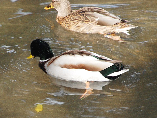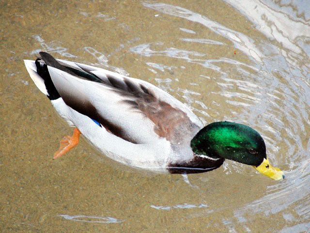 | マガモは北半球の冷帯域から温帯域にかけて広く分布している大型のカモで、カモ類の中でも最も生息数が多く、生息域も広い。 北方で繁殖するものは冬期には南に渡り、湖沼や河川、海岸などで群れで生活しているが、冬には国内各地でも普通に見られる。 マガモの雄は首から頭部が光沢のある緑色で、くちばしは黄色をしていて美しい。 また、首には白い輪があり、足はオレンジ色をしている。 雌は淡褐色と暗褐色のまだらで、くちばしはオレンジに黒が混ざっている。 泳ぎもうまく、川面などを泳いでいるのをよく見かけるが、マガモが頭を水に突っ込んだり、逆さまになって餌を探しているようなことはあっても、マガモが水中に潜ることは殆どない。 比較的人に慣れやすく、古くから大切な家禽とされてきたアヒルはマガモを原種としたもので、アイガモ(別名ナキアヒル)はアヒルとマガモの交配種である。 また、マガモはカルガモなどと同じ淡水性のカモで、主に穀物や水草の葉や茎など、植物質のものを多く食べる。 魚やカエルなどの両生類なども食べるが、クロガモのような海鴨とは違って貝類などを主食とすることはない。 カモ類はしばしば狩猟の対象とされるが、マガモの肉はカモ類の中でも良質とされている。 繁殖期は4~8月で、水辺に近い草地に浅い皿状の巣をつくる。 人に馴れやすいことから都市部にある池や河川などでも見かけることがあるが、時に廃屋や街路樹などの洞に巣をつくることもある。 平均して11個ほどの卵を産み、抱卵期間は28日前後。 また、マガモは他のカモ類と同じで、抱卵は雌だけが行う。 飼育下でのマガモの寿命は10~15年、野生下では5~10年と言われている。 しかし、足環による記録では26年を超えることが観察されているので、実際の生得寿命はかなり長いものだろう。 |
